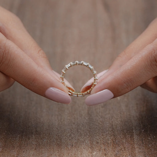 Our eternity rings feature lab-grown diamonds in round cut, emerald cut, pear