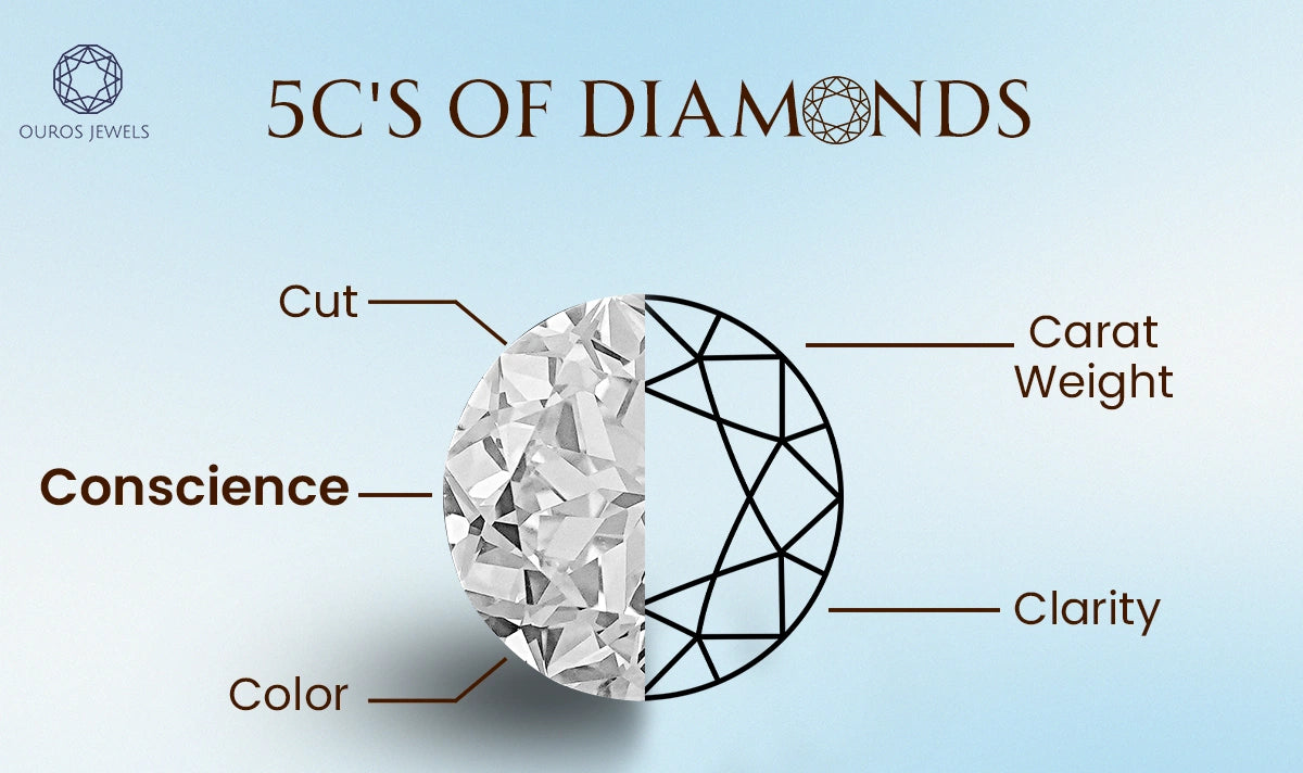 The 4 C’s of diamonds: Cut, Color, Clarity, and Carat are the global standard for understanding a diamond’s quality, beauty, and value. Each plays a distinct role in how a diamond looks and is priced. Today, many buyers also consider a 5th c for diamonds: Conscience, which reflects how ethically and responsibly the diamond is made or sourced, helping you choose a diamond that looks beautiful and aligns with your values, without overspending.
