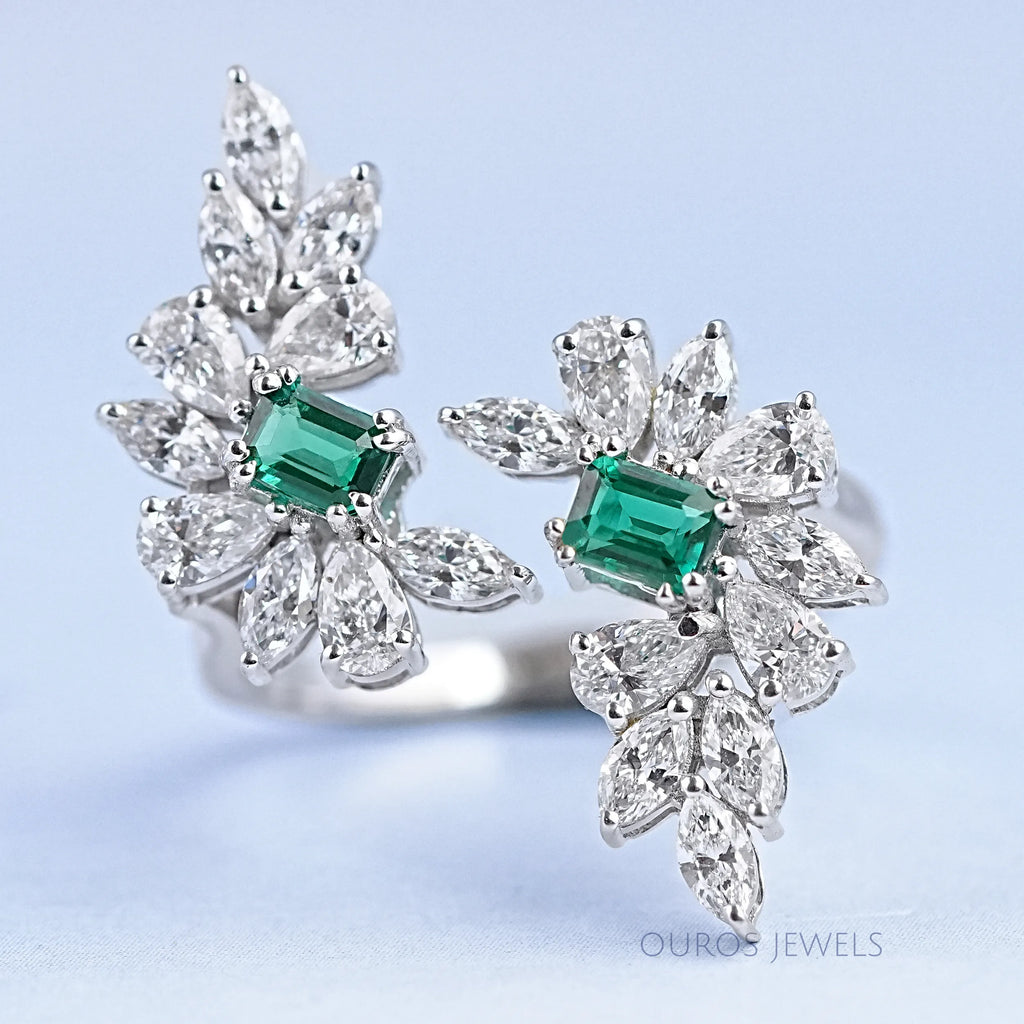 front view of green asscher cut gemstone diamond halo anniversary ring
