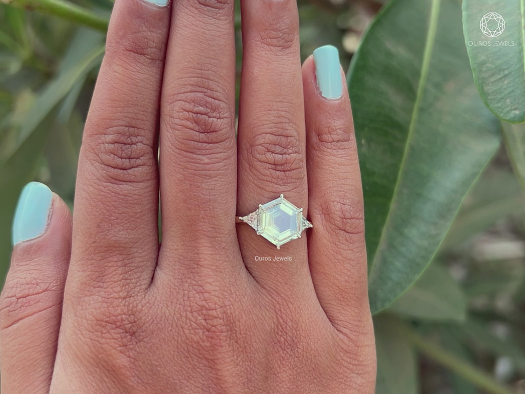 Step Cut Hexagon Shape Lab Diamond Three Stone Ring