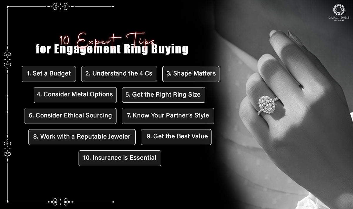 When picking out an engagement ring, think about whether you'll shop alone or with your partner. Start by imagining the design, including the shape and size of the stone and the type of metal for the band. it's crucial to check the quality and authenticity of the gem while keeping your budget in mind, as engagement rings can be expensive.