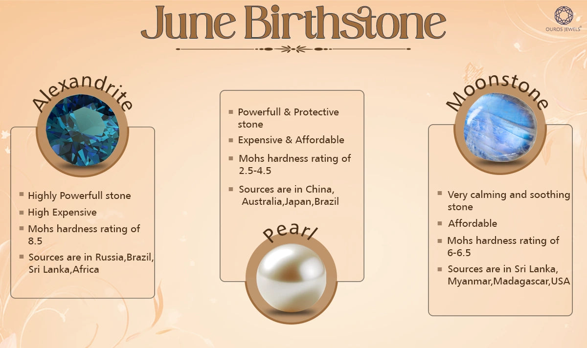 June birthstones are pearl, moonstone, and Alexandrite, each with their own unique beauty and history.