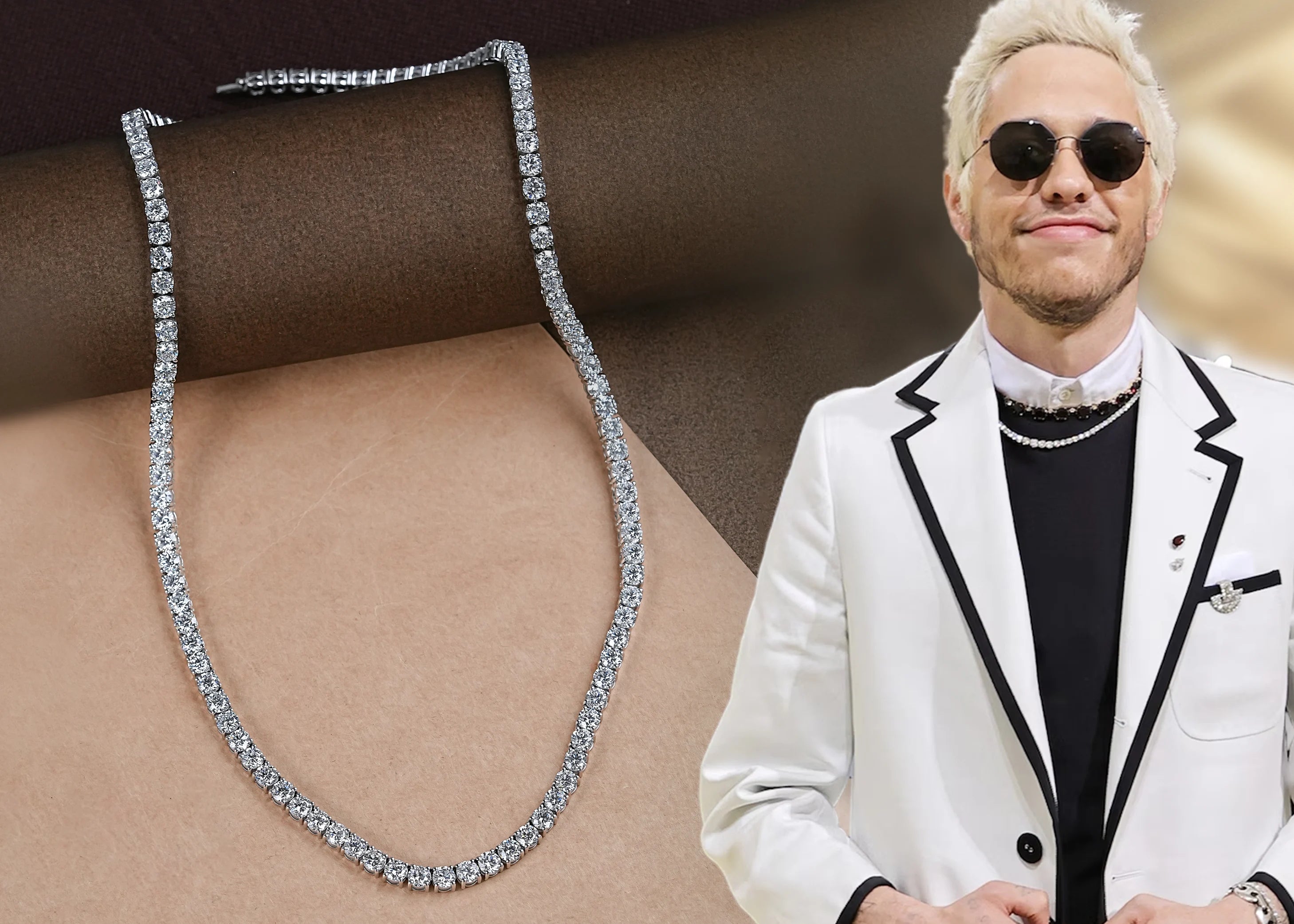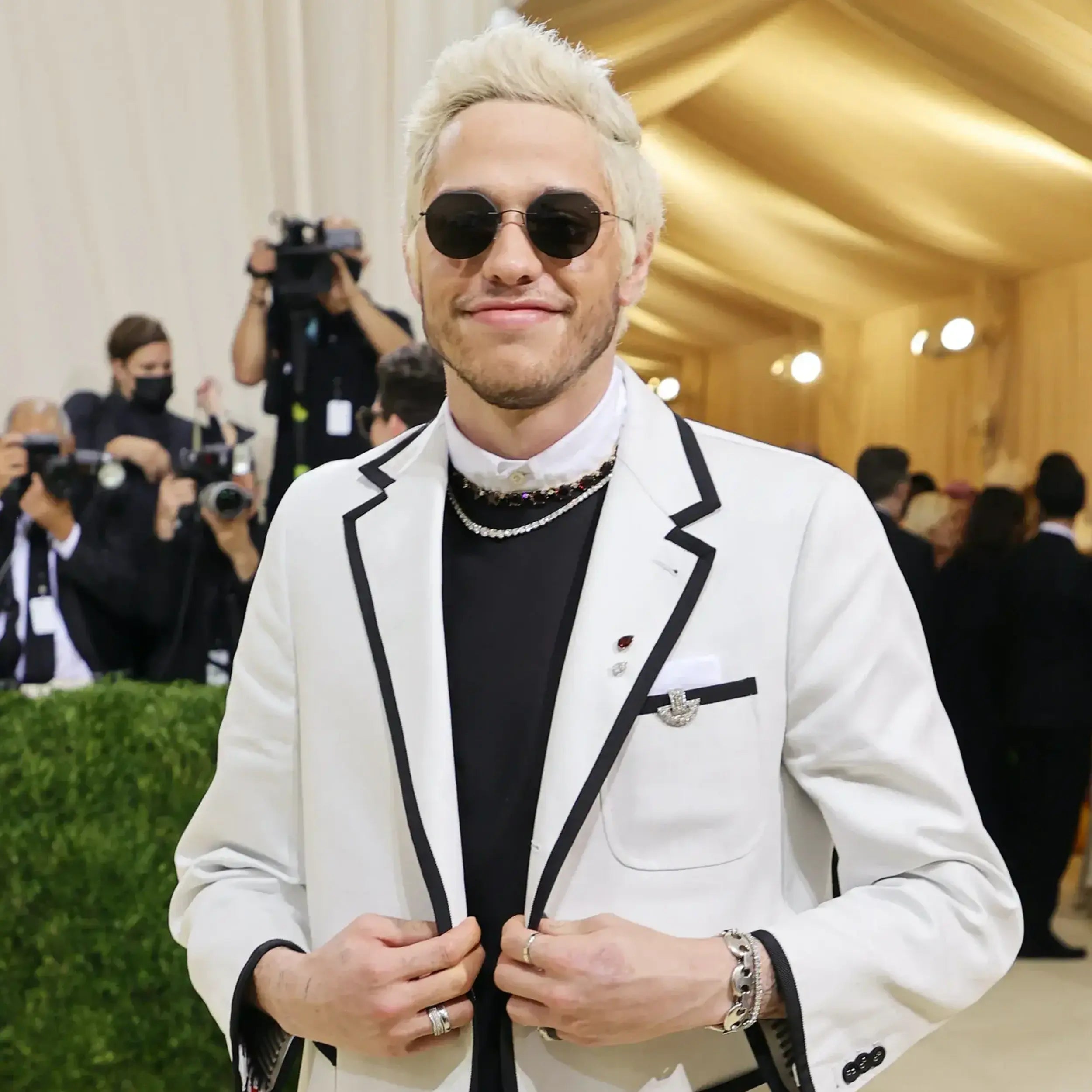 At the 2021 Met Gala, Pete Davidson wore a standout piece of jewelry: a large, silver cross necklace that complemented his overall look. The necklace, which added a touch of boldness to his outfit, contributed to the edgy and somewhat rebellious vibe he was going for. It was a simple yet striking accessory that added to his punk-inspired style while maintaining the understated yet distinctive look that has become part of Davidson's fashion identity.